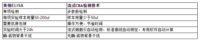 4、更高的靈敏度、更寬的檢測范圍和更好的重復性。CBA技術使蛋白定量的分析靈敏度高達pg/ml級別,檢測范圍達0-5000pg/ml,所有分析只需一組標準曲線。根據抗體的熒光強度對目的蛋白定量,排除了ELISA反應中酶聯放大產生的假陽性。